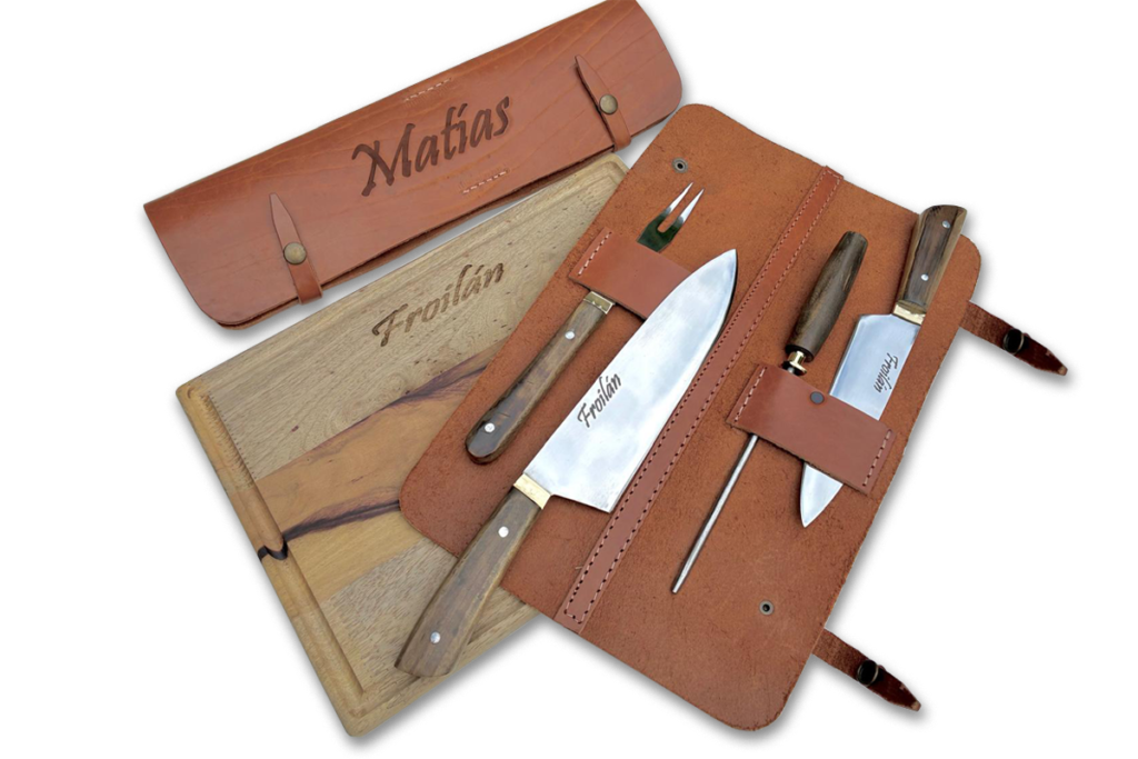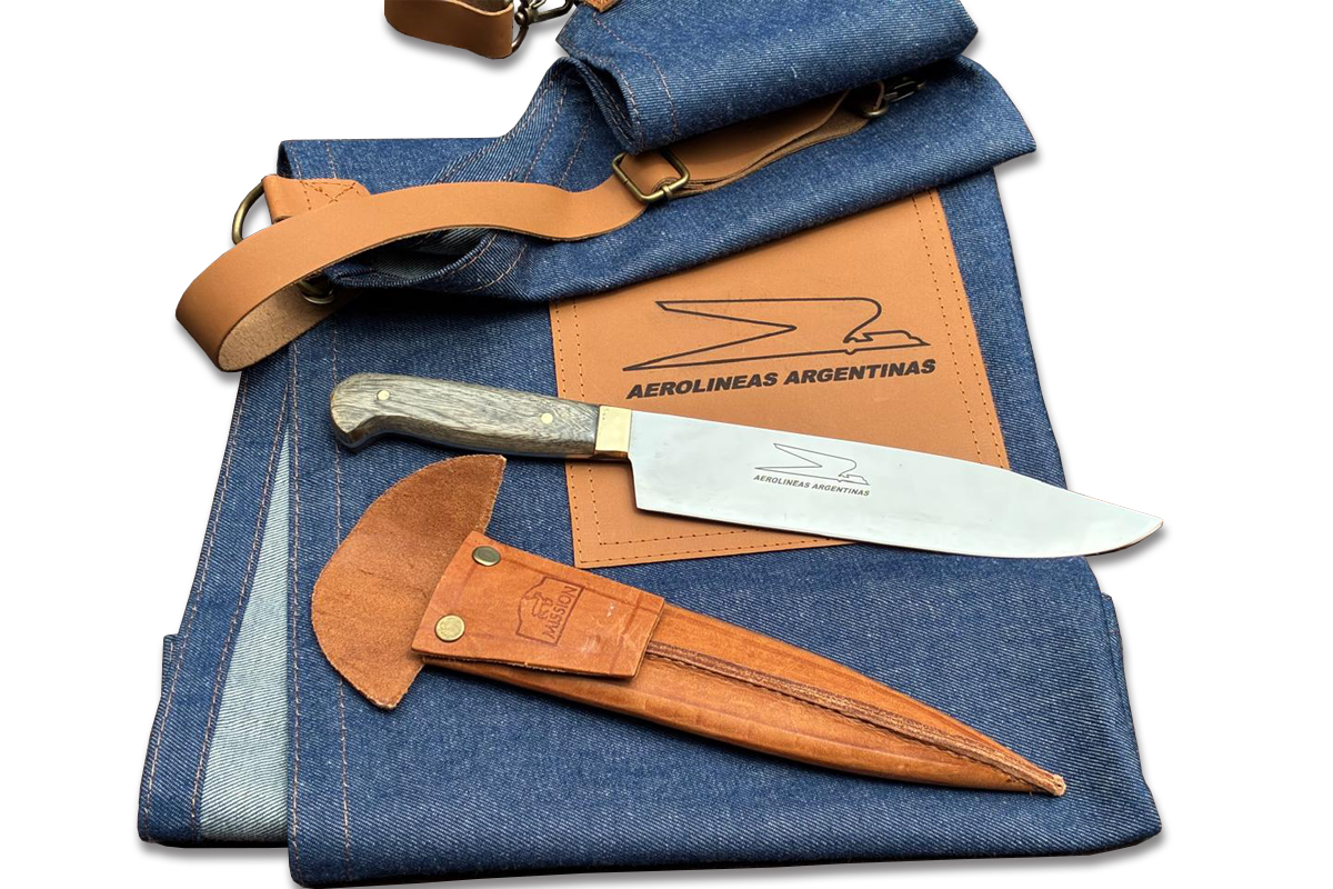 Delantal Jeans con bolsillo cuero grabado logo -cuchilla con vaina -grabado logo.