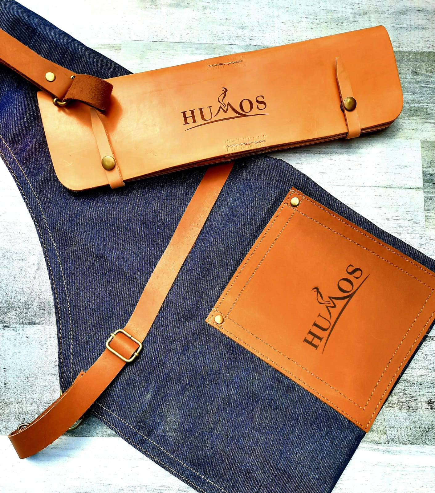 delantal jeans con bolsillo cuero – estuche Asador con logo