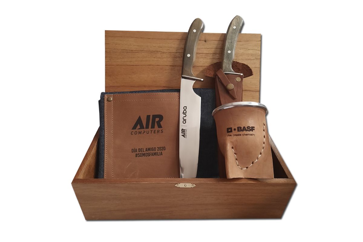 Mate calabaza natural , vaqueta cuero con logo- Delantal jeans con logo –cuchilla con vaina de cuero Largo total 41 cm con logo – Caja Madera